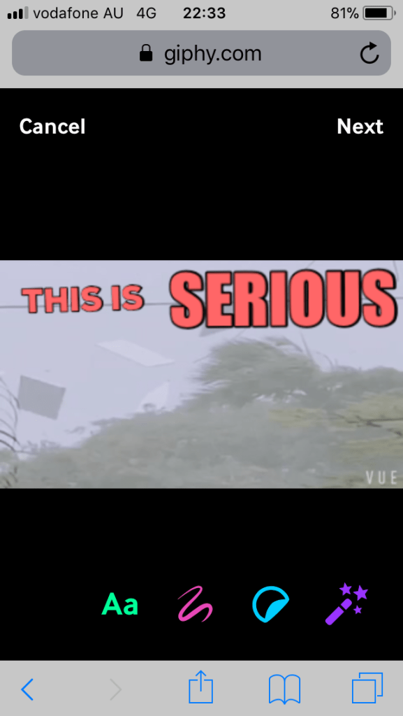 Second, I used the website GIPHY to generate this Gif.The moving image help create an anxious mood to infect audiences’ emotion.The ” THIS IS SERIOUS” text all in capital and red can easily capture audiences’s attention and clear the motive of this Gif.